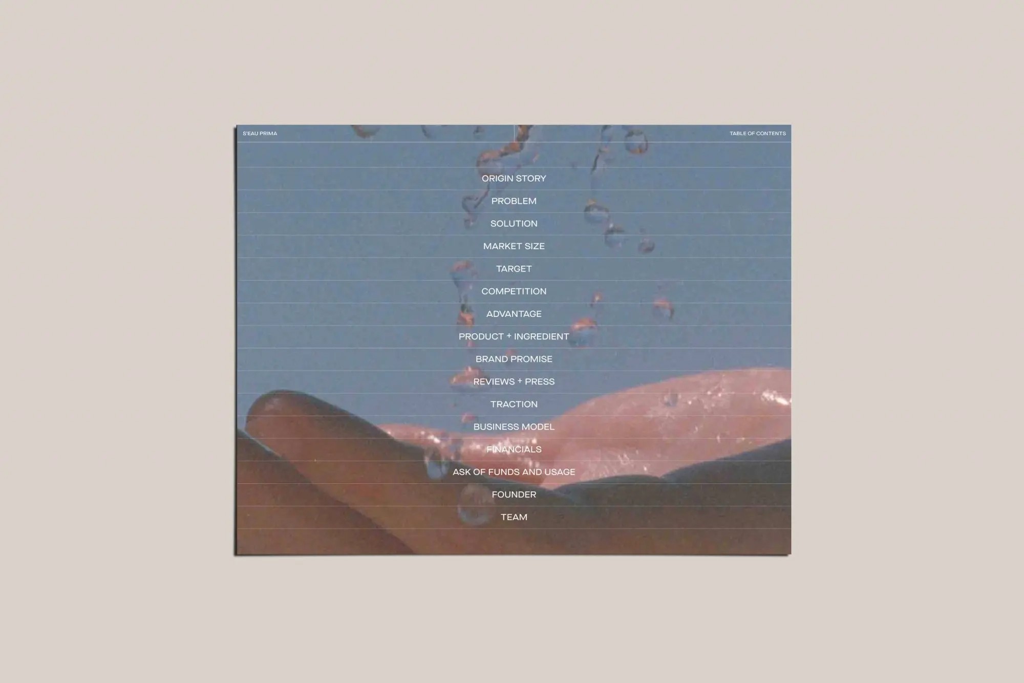 Art Direction + Deck Design for S’eau Prima // The science of skin meets the spirit of self 💧 A modern wellness brand defined by clarity and calm. This investor deck channels the brand’s essence through refined minimalism, clean typography, and intentional pacing. Designed to feel as pure and powerful as the product itself—each slide tells a story of skin-first wellness, grounded in both beauty and science.